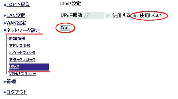 | 4. | [ネットワーク設定]−[UPnP]を選択します。UPnP機能を「使用しない」を選択し、[設定]をクリックします。 ![]() |